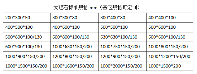 大理石平臺(tái)在工廠檢驗(yàn)、測(cè)量,實(shí)驗(yàn)室實(shí)驗(yàn)等方面都適用,大理石平臺(tái)一般規(guī)格從200*2002000*4000mm不等,我們有自己的標(biāo)準(zhǔn)規(guī)格(見(jiàn)圖1。有時(shí)候客戶需要的尺寸并不是標(biāo)準(zhǔn)規(guī)格,就需要定制,這時(shí)候會(huì)有客戶考慮說(shuō)定制大理石平臺(tái)是不是比標(biāo)準(zhǔn)的價(jià)格高,其實(shí)并不是這樣的。大理石平臺(tái)的加工是先采用鋸床切割出適合的尺寸,然后經(jīng)過(guò)人工研磨制成的。不管是標(biāo)準(zhǔn)規(guī)格還是定制規(guī)格,它們的加工工序都是一樣的,像不需要打孔開(kāi)溝槽的大理石平臺(tái),石料我們是按方算的,而人工研磨的費(fèi)用是按平方算,所以定制的大理石平臺(tái)價(jià)格并不高。如果是定制打孔的大理石平臺(tái),那價(jià)格就會(huì)用變化了,這時(shí)候就需要按孔的大小,孔位精度的要求,還要孔的數(shù)量來(lái)核算價(jià)格。還有一點(diǎn)就是材質(zhì)的選擇,如果要定制濟(jì)南青材質(zhì)的大理石平臺(tái),那價(jià)格就要按濟(jì)南青石料來(lái)算價(jià)格。